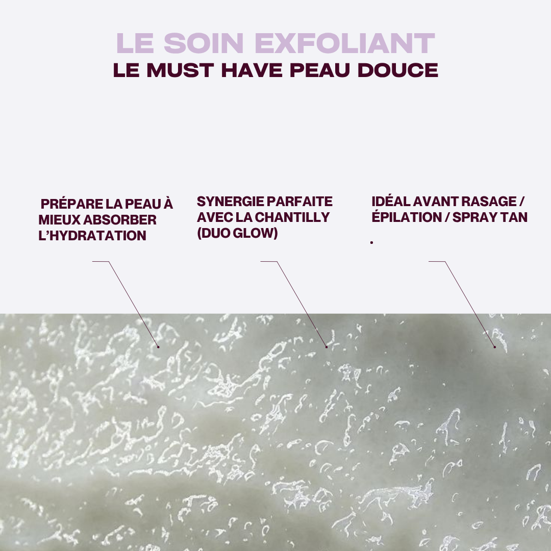 - Le gommage exfolie en douceur, lisse la peau, réduit les poils incarnés et améliore l’éclat naturel.