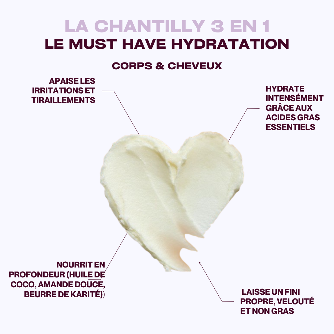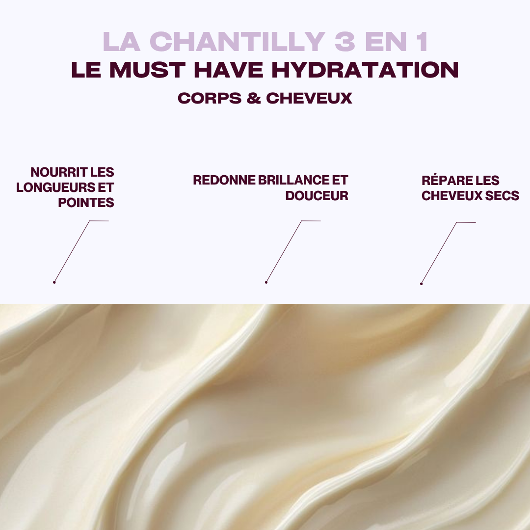 Étape 2 – Chantilly : Sur peau nettoyée et essuyée, applique une noisette de chantilly, fais-la fondre sur tout le corps ou sur les zones à hydrater. Masser jusqu’à absorption.